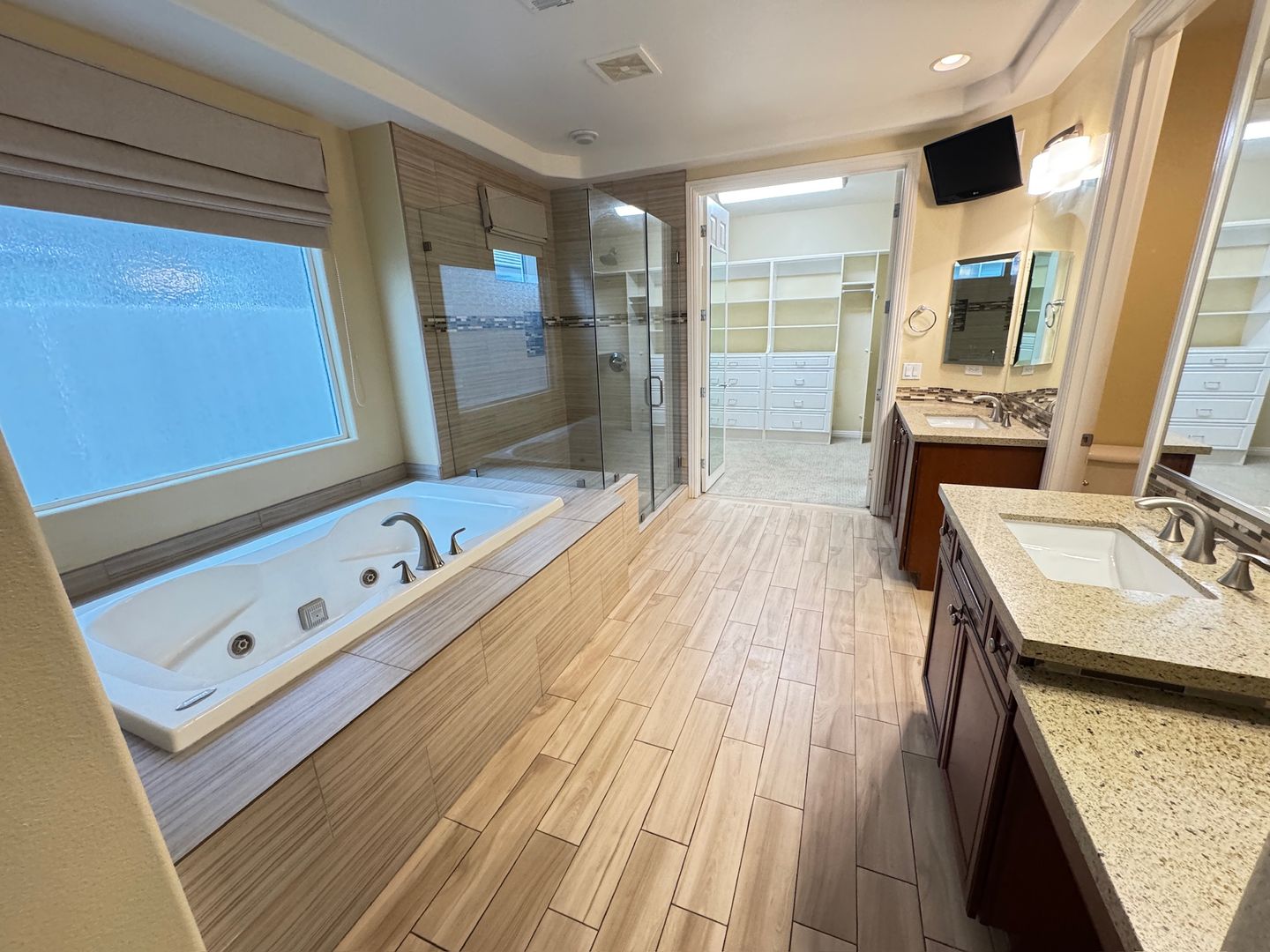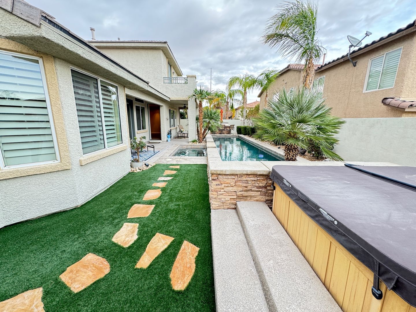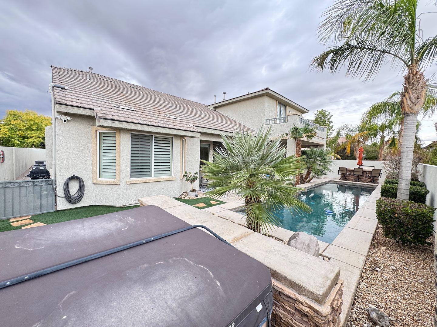 Welcome to the Spacious 4 Bedroom Home with Private Pool, located in the Northwest. This home boasts four generously sized bedrooms and four full bathrooms, providing ample space for comfort and convenience. The interior features ceiling fans, a tankless water heater, and a cozy fireplace, ensuring a comfortable living environment year-round. The kitchen is adorned with stunning stone countertops, while the bedrooms are carpeted for added warmth. The home also features ceramic tile flooring throughout, adding a touch of elegance. The built-in closet organization system and built-in cabinets in the single car garage offer plenty of storage space. Step outside to your private oasis, complete with a pool and spa. The front courtyard and private balcony provide additional outdoor spaces to enjoy the sunshine. For those who love to entertain, the built-in BBQ is a great feature. Plus, with quarterly landscaping maintenance included, you can enjoy a beautiful yard without the hassle. This home truly offers a luxurious and convenient lifestyle.